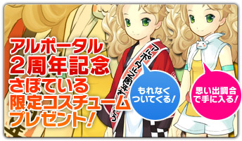 さぽているユーザーのみなさん必見!アルポータル2周年記念として新コスチュームが登場!もちろんこの2周年記念のためだけに用意された限定コスチュームです!早速新コスチュームをさぽているに着させてあげよう!