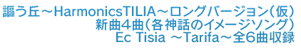 「謳う丘〜Hamonics TILIA〜」のロングバージョンはもとより、ゲーム中でも使用された未発表曲「Ec Tisia 〜Tarifa〜」に加え、志方あきこによる新曲も追加した豪華CDです!