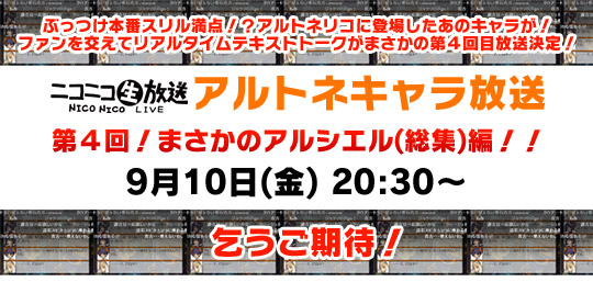 | ▼アルトネキャラ放送 第4回放送日▼ 第4回:9月10日(金)20:30〜(2時間) ▼アルトネキャラ放送 放送会場はこちら!▼ |