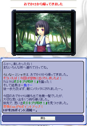 「おでかけ」から帰ってきたところ。パラメーターが上がったり、アイテムをゲットしたり、『愛情』ポイントが上がればもっとレーヴァテイルが心を開いてくれるかも!?
