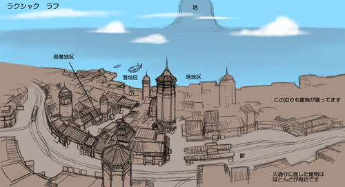 にはラクシャクの町並み、そして下には巨大な飛空挺が何隻も停泊している姿。